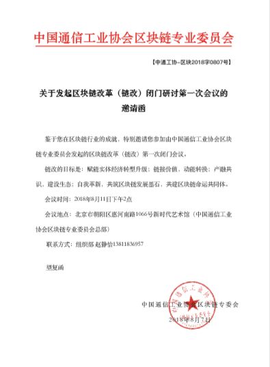 鉴于您在区块链行业的成就,特别邀请您参加由中国通信工业协会区块链专业委员会发起的区块链改革(链改)第一次闭门会议。